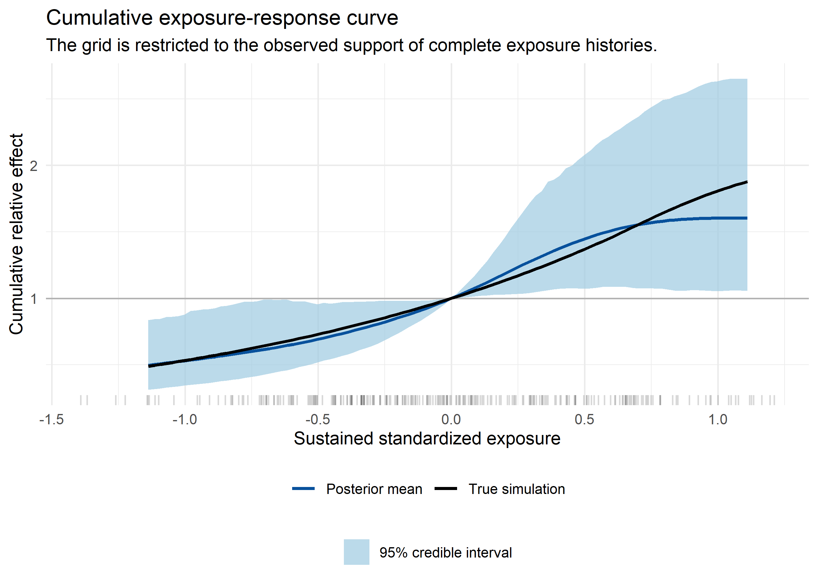For this curve, I used a more conservative exposure grid than in the surface plot. The surface plot used the marginal range of all lagged exposures, but a sustained exposure is a full exposure history. Asking for all lags to be held at a marginal tail value would extrapolate beyond the histories that were actually observed. I therefore based the cumulative grid on the central range of the row-wise mean exposure history.