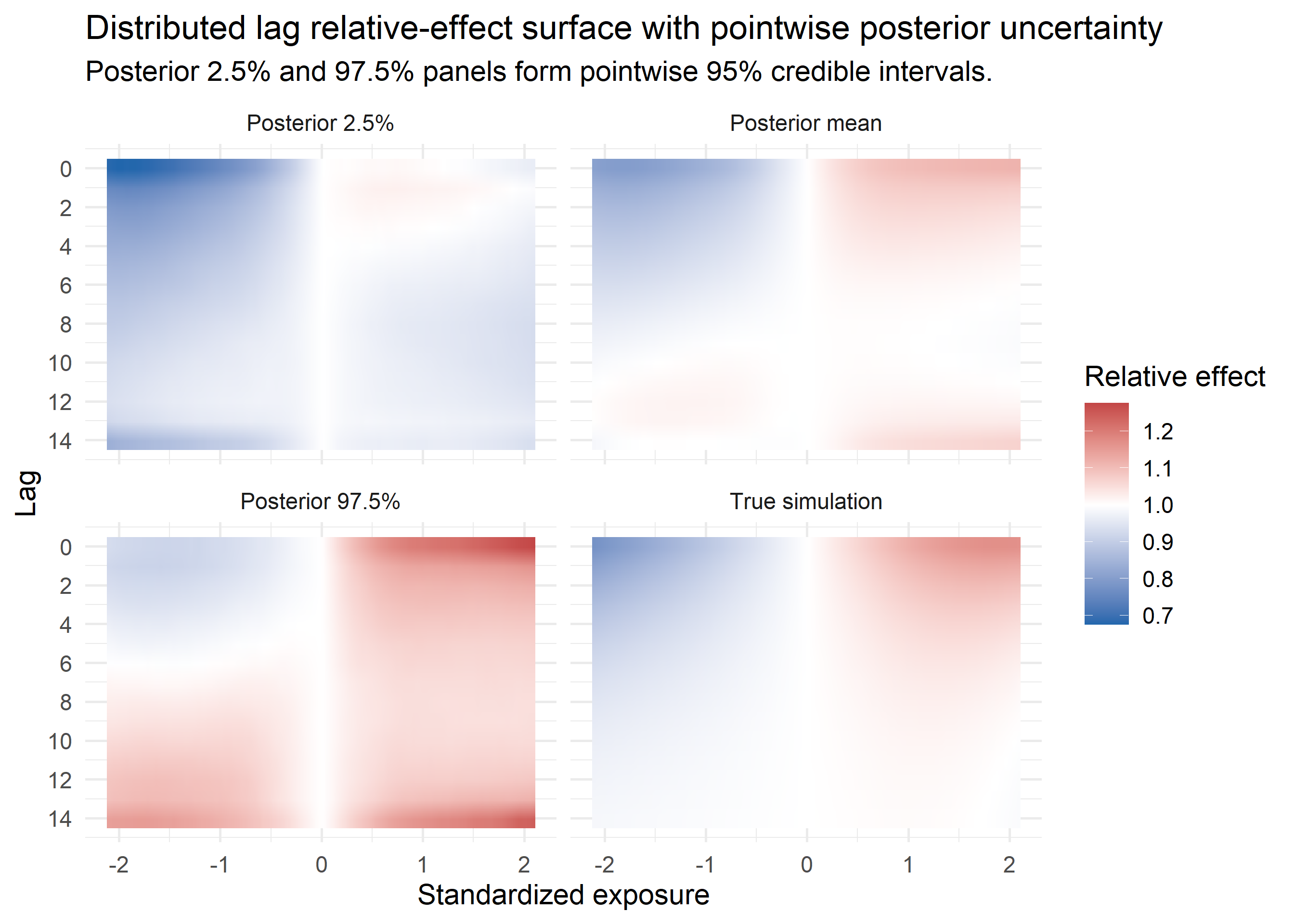 In settings with substantial uncertainty, as in this small simulated example, that simpler latent effect can be preferable because it reduces the number of smoothing hyperparameters that must be learned from the data. I used generic3 here because it is more general and makes the exposure-direction and lag-direction regularisation explicit.