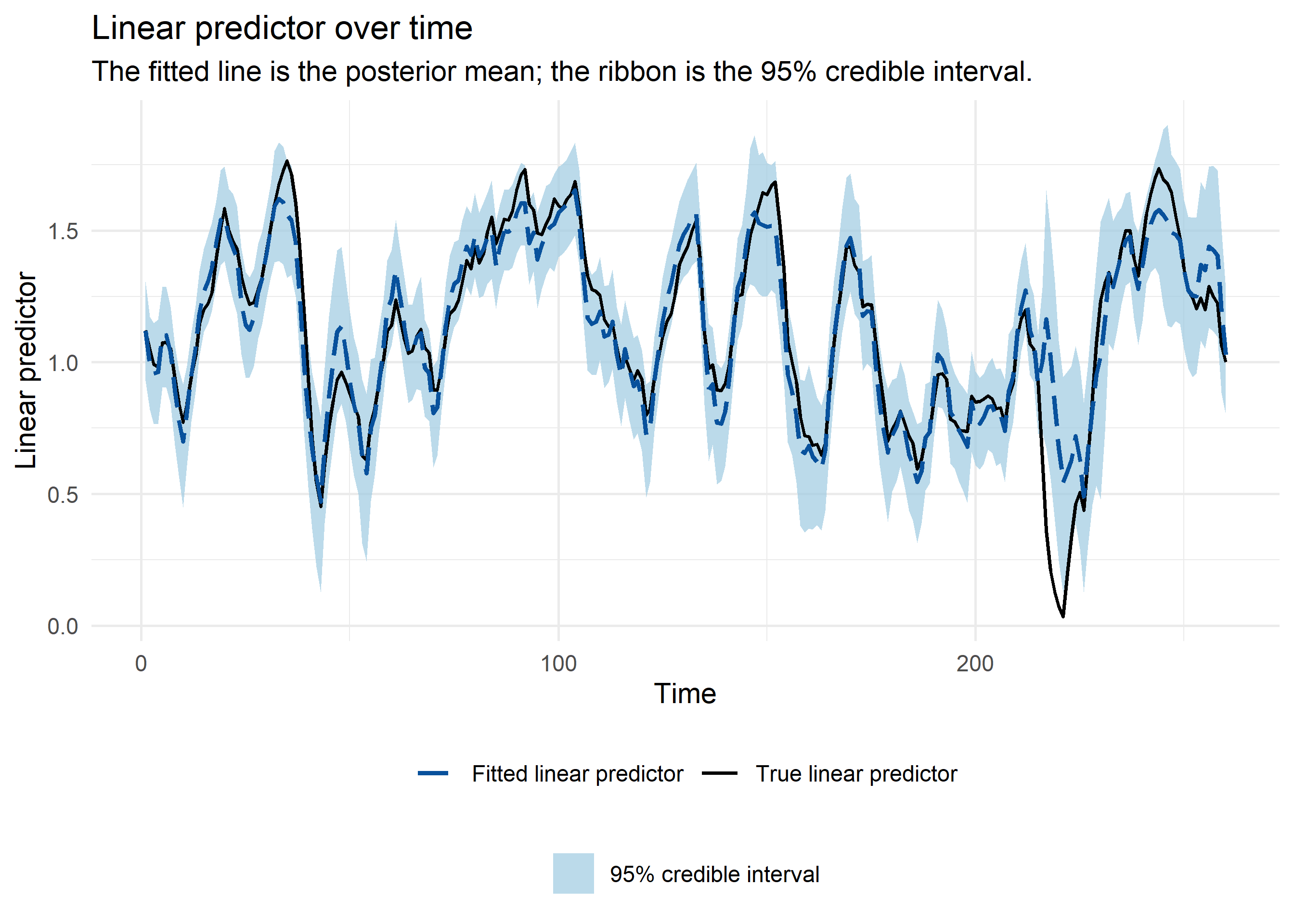 eta_prediction <-predict( fit_dlnm,formula =~data.frame(eta = Intercept + dlnm),n.samples =1000,seed =20260426)mu_prediction <-predict( fit_dlnm,formula =~data.frame(mu =exp(Intercept + dlnm)),n.samples =1000,seed =20260426)prediction_df <-data.frame(time =seq_along(y),eta_true = eta,eta_mean = eta_prediction$mean,eta_q025 = eta_prediction$q0.025,eta_q975 = eta_prediction$q0.975,mu_true =exp(eta),mu_mean = mu_prediction$mean,mu_q025 = mu_prediction$q0.025,mu_q975 = mu_prediction$q0.975)ggplot(prediction_df, aes(x = time)) +geom_ribbon(aes(ymin = eta_q025,ymax = eta_q975,fill ="95% credible interval" ),alpha =0.7 ) +geom_line(aes(y = eta_true,colour ="True linear predictor",linetype ="True linear predictor" ),linewidth =0.7 ) +geom_line(aes(y = eta_mean,colour ="Fitted linear predictor",linetype ="Fitted linear predictor" ),linewidth =0.85 ) +scale_colour_manual(values =c("True linear predictor"="black","Fitted linear predictor"="#08519c" ) ) +scale_linetype_manual(values =c("True linear predictor"="solid","Fitted linear predictor"="longdash" ) ) +scale_fill_manual(values =c("95% credible interval"="#9ecae1") ) +guides(fill =guide_legend(order =2),colour =guide_legend(order =1),linetype =guide_legend(order =1) ) +labs(x ="Time",y ="Linear predictor",colour =NULL,linetype =NULL,fill =NULL,title ="Linear predictor over time",subtitle ="The fitted line is the posterior mean; the ribbon is the 95% credible interval." ) +theme(legend.position ="bottom",legend.box ="vertical" )