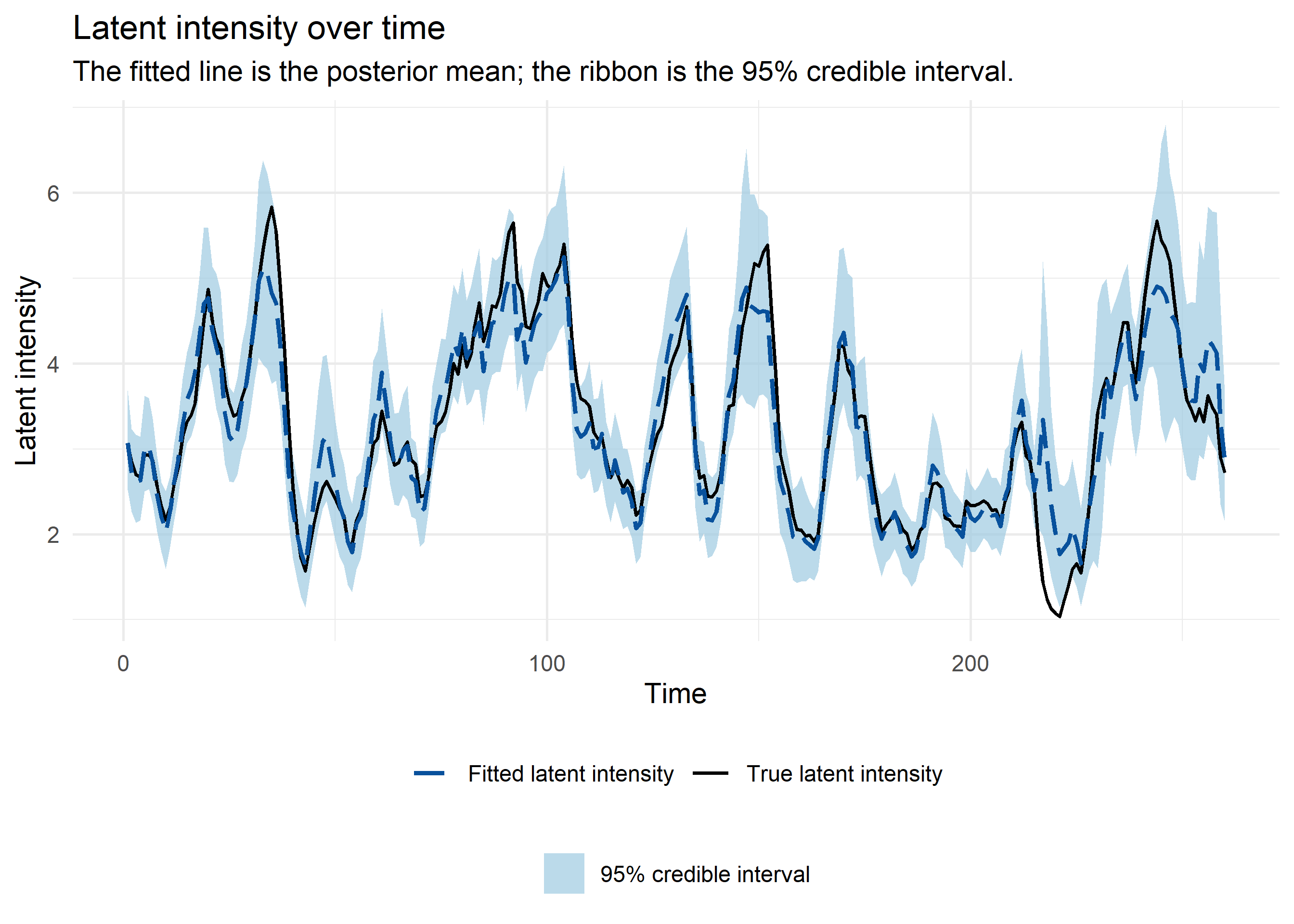 In the linear-predictor plot, the true curve was mostly inside the 95% credible interval, apart from a short stretch after time 200. That departure occurred where the latent intensity was low. On the observation scale, this produced many zeros and ones, which made the depth and timing of the trough weakly identified.