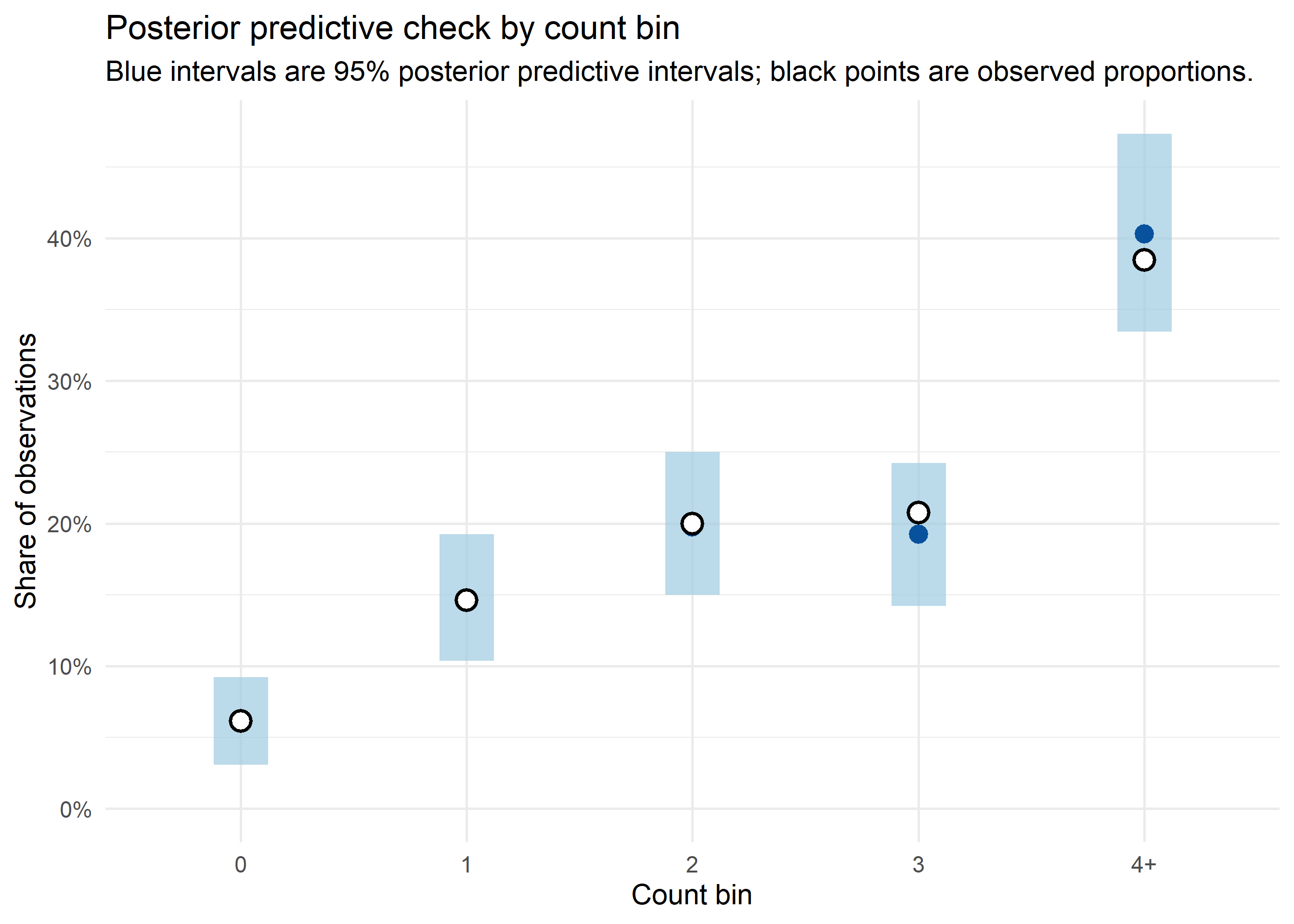 For the posterior predictive check, I added the observation noise back in. The predict() call below sampled the latent mean \(\mu_t = \exp(\alpha + A_t\theta)\), rpois() drew replicated counts from the Poisson observation model, and the result was reduced to count-bin proportions. This checked whether the fitted model reproduced the discrete distribution of the observed response, rather than only the latent mean.