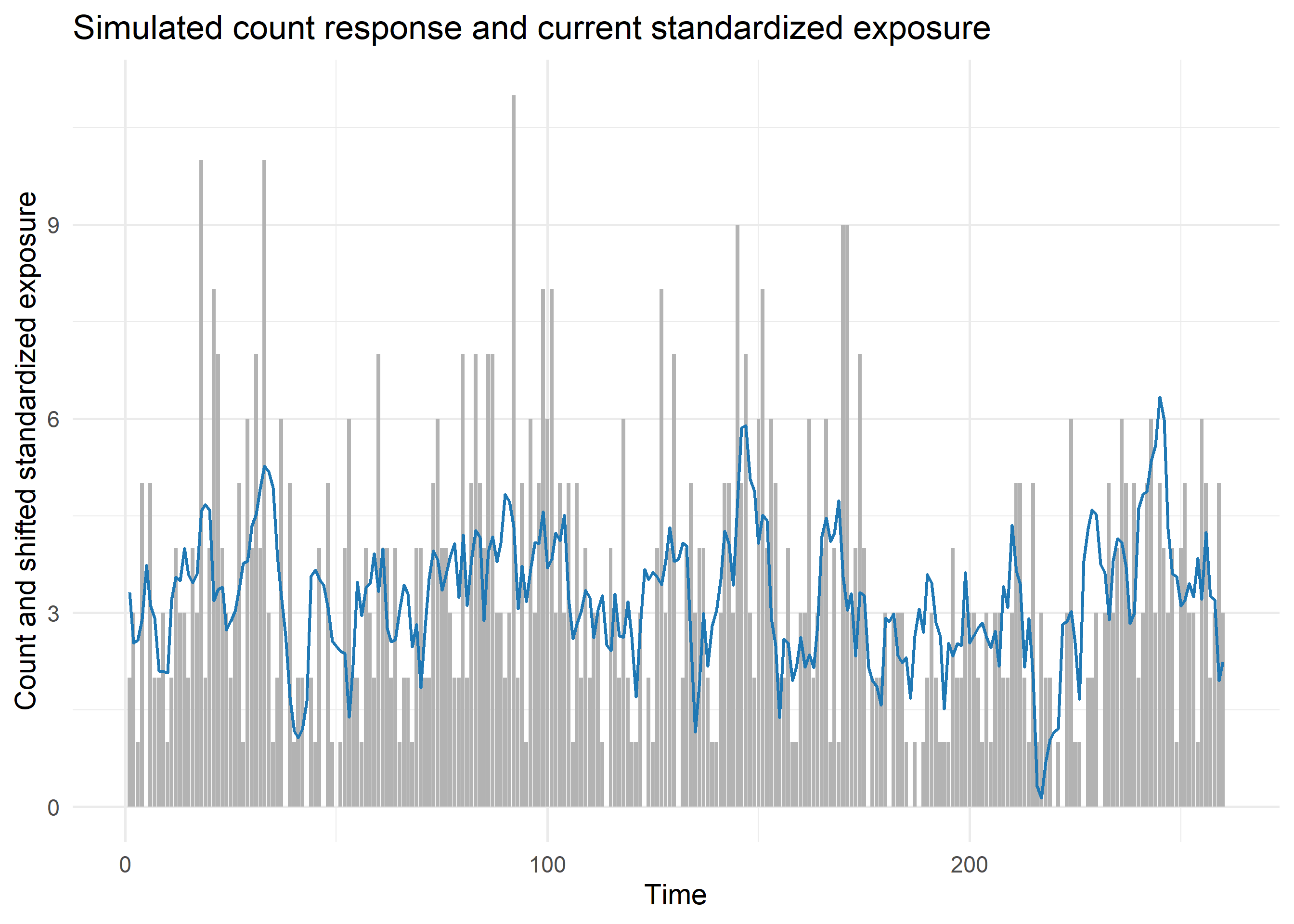 This construction was deliberately explicit. In a real analysis, I would add the usual time-series structure around the DLNM term: seasonal terms, long-term trend, calendar effects, overdispersion if the Poisson variance is too small, and possibly autocorrelated residual structure. The cross-basis term is only one part of the linear predictor.